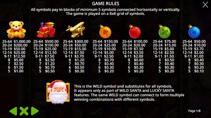 Santa’s Wonderland plays out on a chunky 8x8 grid using cluster pays, not paylines. That means you’re gunning for clusters of five or more matching symbols, horizontally or vertically. I’ve spun it on everything from a phone to a big monitor and it looks solid everywhere, no awkward squinting or clunky controls.